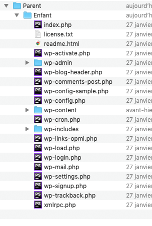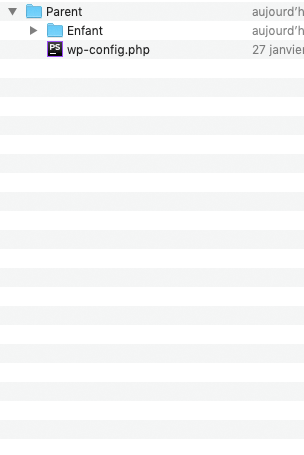 Par exemple, imaginons un dossier “Parent”, à l’intérieur duquel se trouve un dossier “Enfant”. Et dans ce dossier “Enfant” se trouve notre installation WordPress :