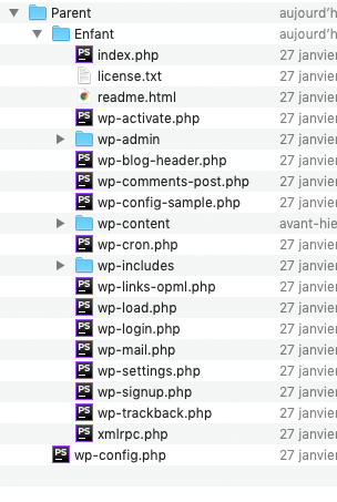 En fermant le dossier “Enfant”, c'est tout de suite plus évident : le fichier wp-config.php est désormais tout seul dans le dossier “Parent”. Les autres fichiers WordPress sont restés dans le dossier “Enfant”.